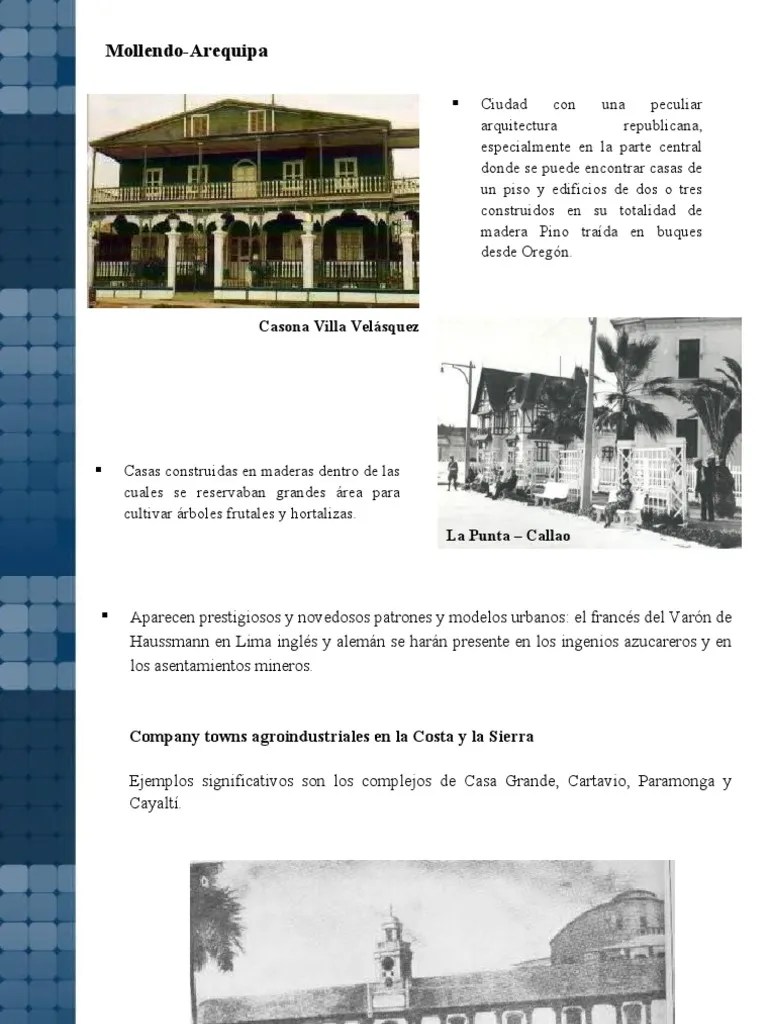 Granja dedicada a los trabajos propios del campo, tenía una serie de construcciones aptas para esta función. Lugares de culto los romanos primitivos no tenían templos, ni tampoco estatuas, ni figuras. La arquitectura civil se encarga de la construcción de edificios, casas, escuelas, hospitales, para el funcionamiento de la vida en sociedad. Residencia del señor, podía estar formada por grandes edificios de pavimentos decorados con mosaicos y paredes con bellas … granja dedicada a los trabajos propios del campo, tenía una serie de construcciones aptas … El augur trazaba en el espacio un templo simbólico con su báculo (especie de bastón), y en aquel ámbito interpretaba las señas, que podían ser buenas o malas... La evolución de la arquitectura civil domestica arequipeña presenta tres características, esquemas estructurales constantes dentro de cada periodo, ausencia de solución única y superposición de elementos en distintos periodos, la evolución esta marcada por las reconstrucciones que se realizan después de los sismos.