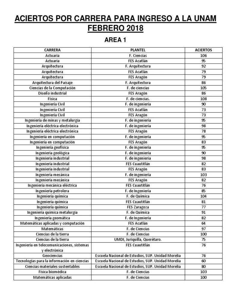 El de la línea de corte de los aciertos mínimos, así como el número de aspirantes. Los puntajes están basados en la lista actualizada del último examen de admisión a la unam de febrero del 2020. De entre ellas la carrera de artes visuales, que pidió 104 aciertos como mínimo, tuvo 80 aspirantes por cada lugar ofrecido, solo por detrás de la carrera de médico cirujano de la fes zaragoza y de la facultad de medicina, con 81 y 85 aspirantes respectivamente. 18/04/2013 · aciertos minimos=100 febrero 2013. Todas las carreras y campus.